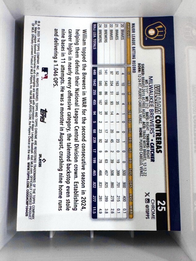 You are purchasing a 2025 Topps Chrome William Contreras #25. You will receive the exact item in the photographs. Thank you for looking.