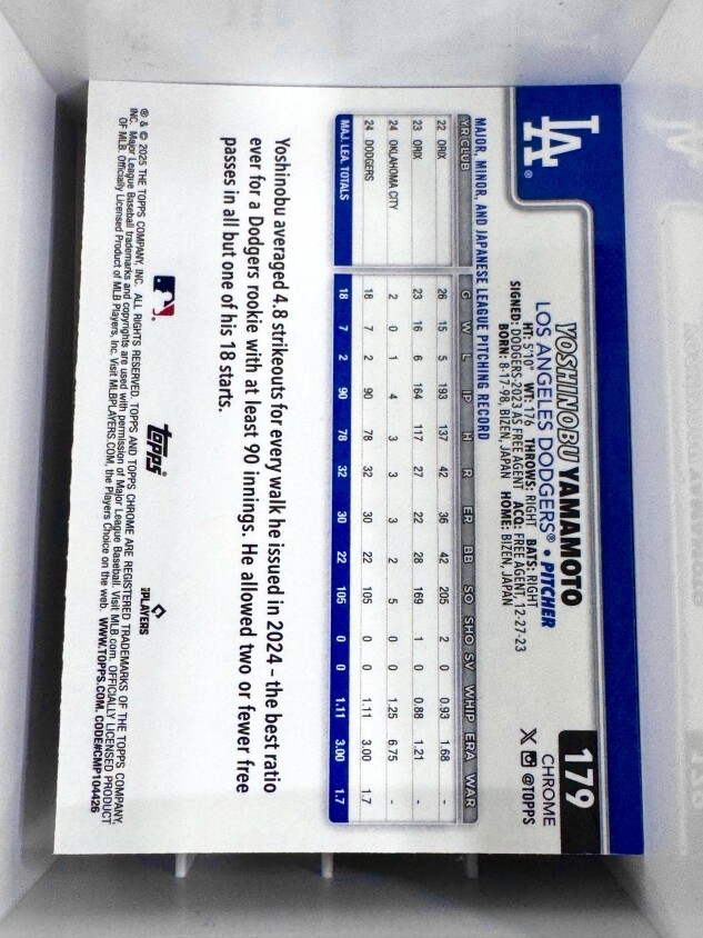 You are purchasing a 2025 Topps Chrome Yoshinobu Yamamoto #179. You will receive the exact item in the photographs. Thank you for looking.