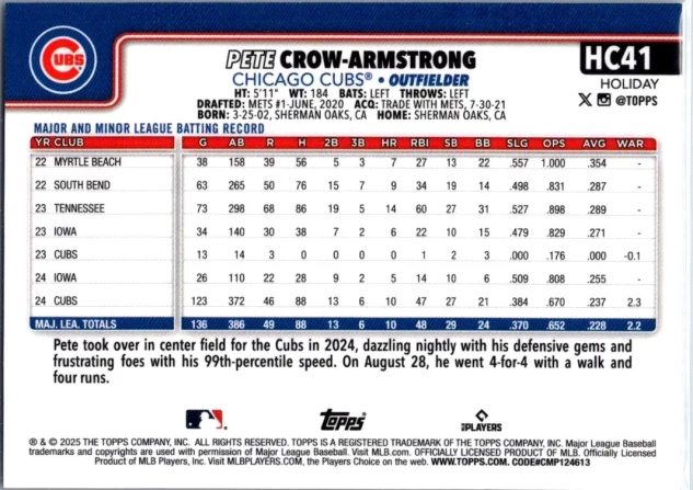 This is a nice example of a 2025 Topps Holiday #HC41 Pete Crow-Armstrong Chrome Gold Refractors