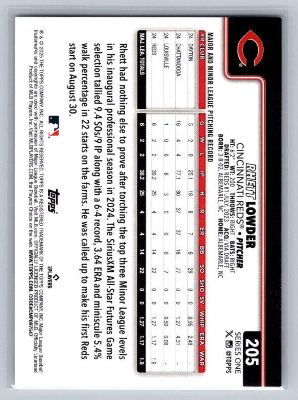 You are purchasing a 2025 Topps Series 1 Rhett Lowder #205 Rookie Cincinnati Reds. You will receive the exact item in the photographs. Thank you for looking.