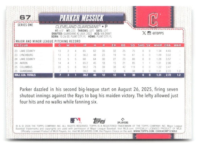 You are purchasing a 2026 Topps Parker Messick #67 RC. You will receive the exact item in the photographs. Thank you for looking.