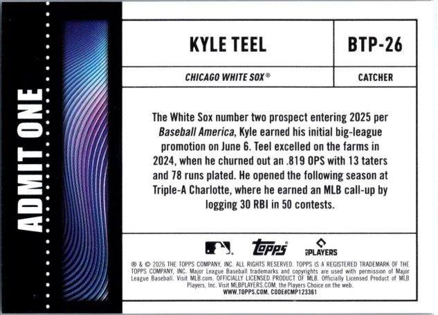 This is a nice example of a 2026 Topps #BTP-26 Kyle Teel Big Ticket Players