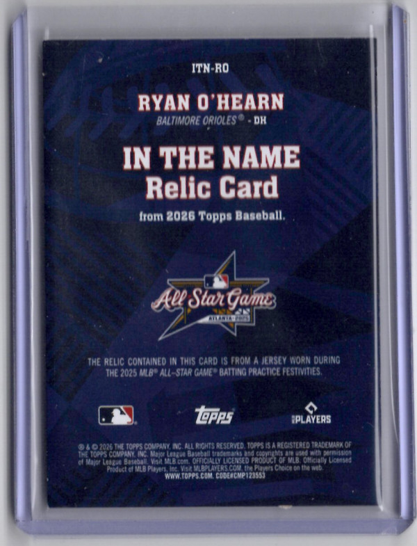 2026 TOPPS IN THE NAME 2025 ALL-STAR GAME RELIC "N" #ITN-RO RYAN O'HEARN (1/1)