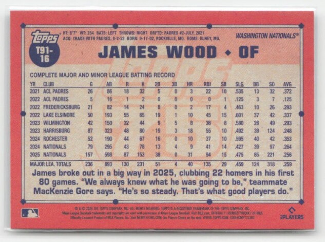 You are purchasing a 2026 Topps James Wood #T91-16 1991 Topps Baseball 35th Anniversary (Series One). You will receive the exact item in the photographs. Thank you for looking.