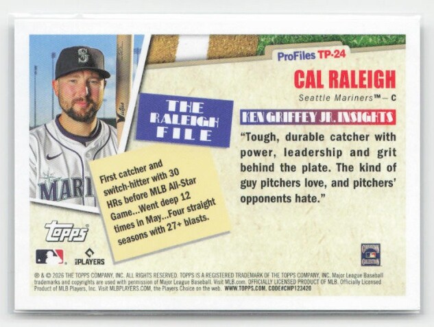 You are purchasing a 2026 Topps Cal Raleigh #TP-24 Topps Profiles. You will receive the exact item in the photographs. Thank you for looking.