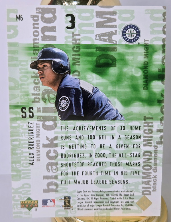 The product is a 2000 Upper Deck Black Diamond Rookie Edition trading card featuring baseball player Alex Rodriguez from the Seattle Mariners. This specific card belongs to the Diamond Might insert set, with card number M6. Manufactured by Upper Deck, this collectible item is a valuable piece for fans and collectors of Major League Baseball memorabilia, especially those interested in rookie cards and unique variations.