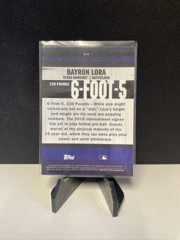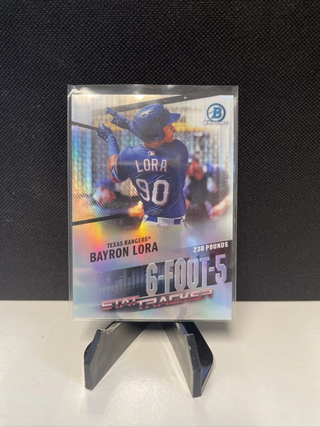 This Bayron Lora 2020 Bowman Chrome trading card is a great addition to any baseball fan's collection. Featuring Lora's stat tracker on the front and the Texas Rangers team logo on the back, this card is perfect for displaying or trading with other collectors.