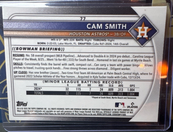 CAM SMITH RC 2025 Bowman Chrome Mega #77 Mojo Refractor Houston Astros MLB