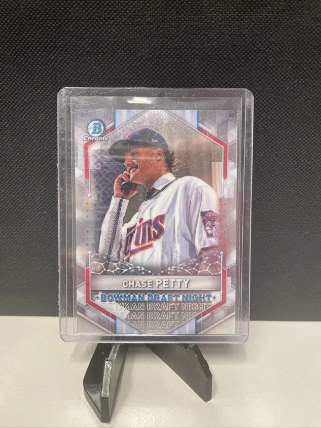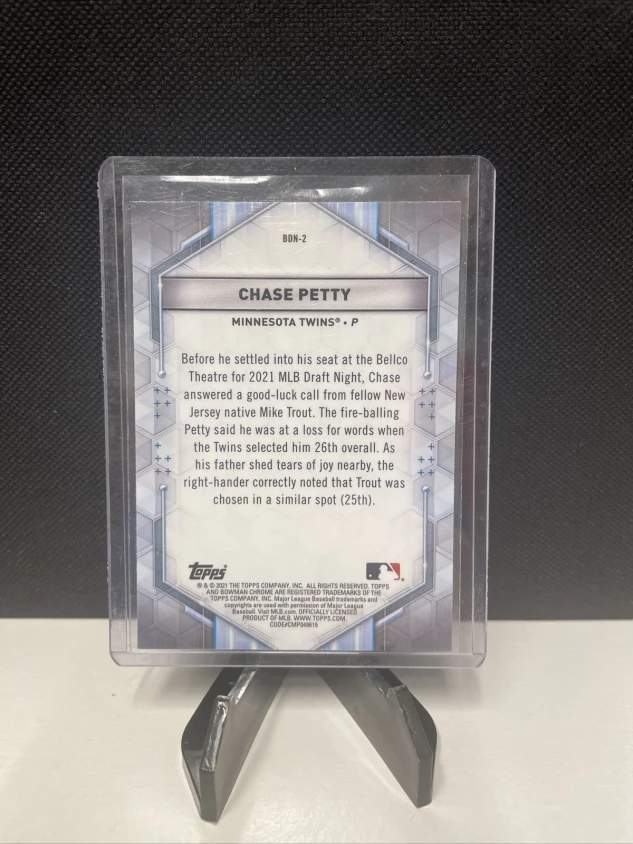 This is a 2021 Bowman Chrome trading card featuring Chase Petty of the Minnesota Twins. The card is an original insert from the Bowman set, made of card stock material with a chrome parallel/variety. The card number is BDN-2 and it was manufactured in the United States in 2021.