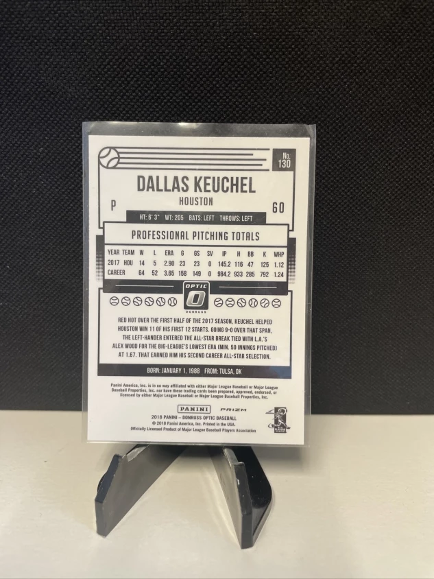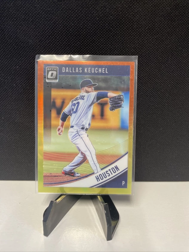 Up for sale is a 2018 Donruss Optic trading card featuring baseball player Dallas Keuchel of the Houston Astros. The card is an original print, made of high-quality card stock material in standard size. Its unique feature is the Orange/Yellow Prizm parallel/variety design, making it a valuable addition to any collector's set.
