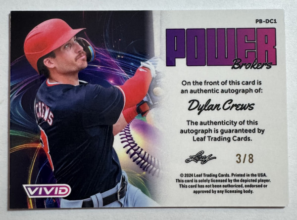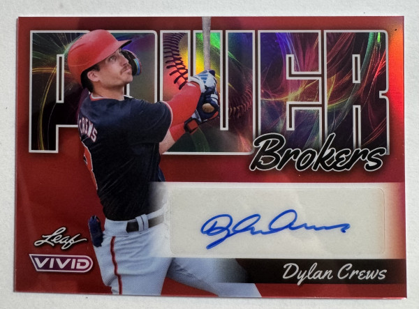 The product is a Dylan Crews 2024 Leaf Vivid Red Power Brokers autographed baseball card, featuring the player from the Washington Nationals. This limited edition card is signed by Dylan Crews and is part of the 2024 Leaf Vivid Baseball set. With a print run of only 8, this rare card is a must-have for collectors of MLB trading cards, especially for fans of the Washington Nationals and rookie card enthusiasts. The card is authenticated by Leaf and is a valuable addition to any sports trading card collection.