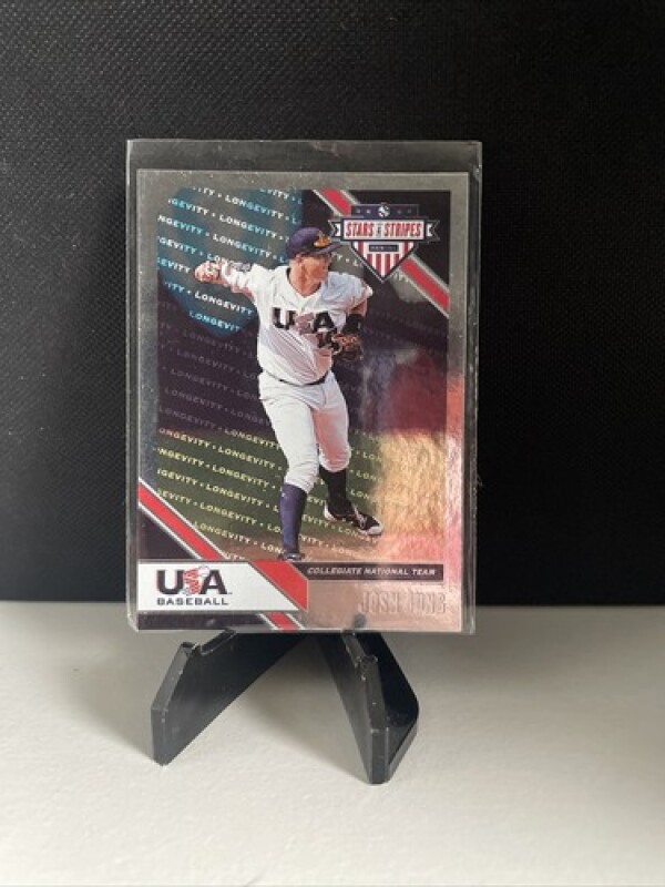 This sports trading card features Josh Jung, a player in Major League Baseball (MLB) who is a part of the Texas Rangers and the USA Baseball Collegiate National Team. The 2019 Panini USA Baseball Stars & Stripes Longevity set includes this original foil card which is made of card stock. It is a standard size card with the card number 92 and was manufactured in 2020 in the United States.