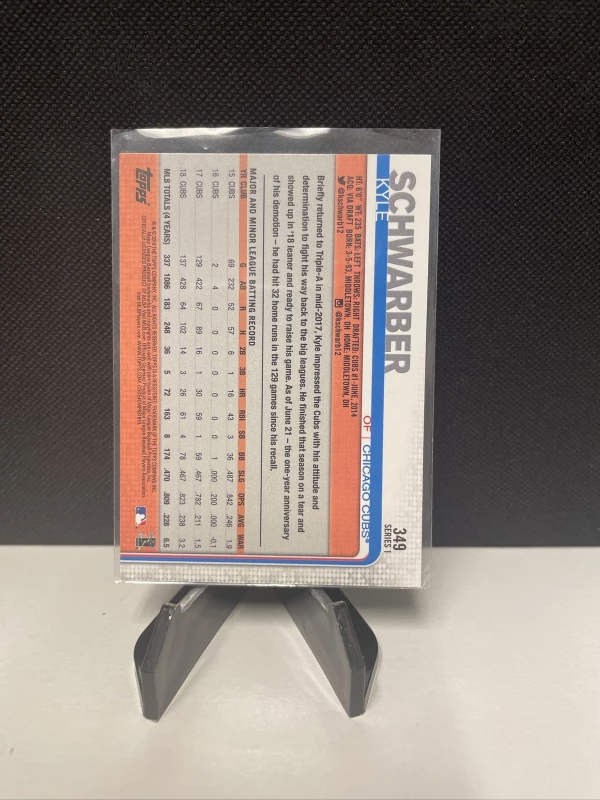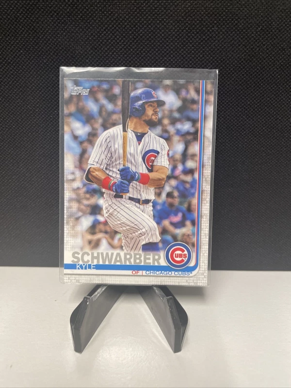 This Kyle Schwarber 2019 Topps #349 baseball trading card is a must-have for any fan of the Chicago Cubs. Show your support for your favorite team with this original card, manufactured by Topps in the United States. The card is made of high-quality card stock material and features the player's name, team, and card number.