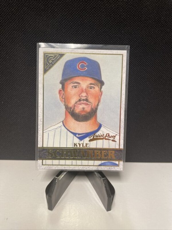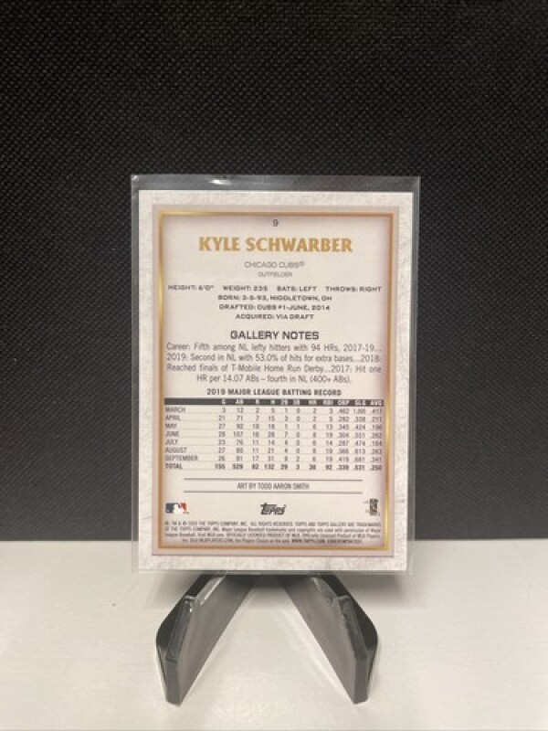 This is a 2020 Topps Gallery sports trading card featuring Kyle Schwarber, a Major League Baseball player for the Chicago Cubs. The card is made of card stock material and is an original, not a licensed reprint. It is a parallel/variety card, specifically an Artist Proof, with card number 9.