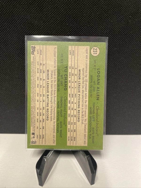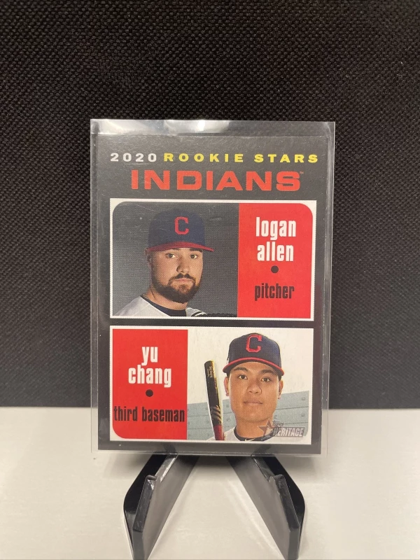 This baseball trading card features Logan Allen and Yu Chang from the Cleveland Guardians, part of the 2020 Topps Heritage set. The card is made of cardstock material and is an original, not a licensed reprint. It is a base set rookie card, numbered 231, and features no autograph or vintage elements.