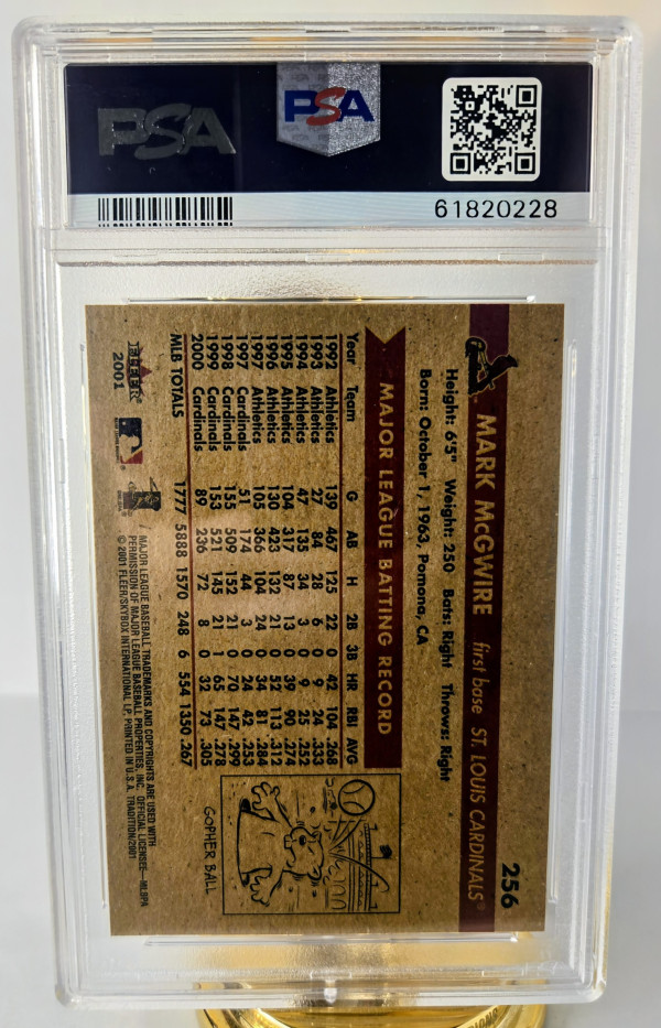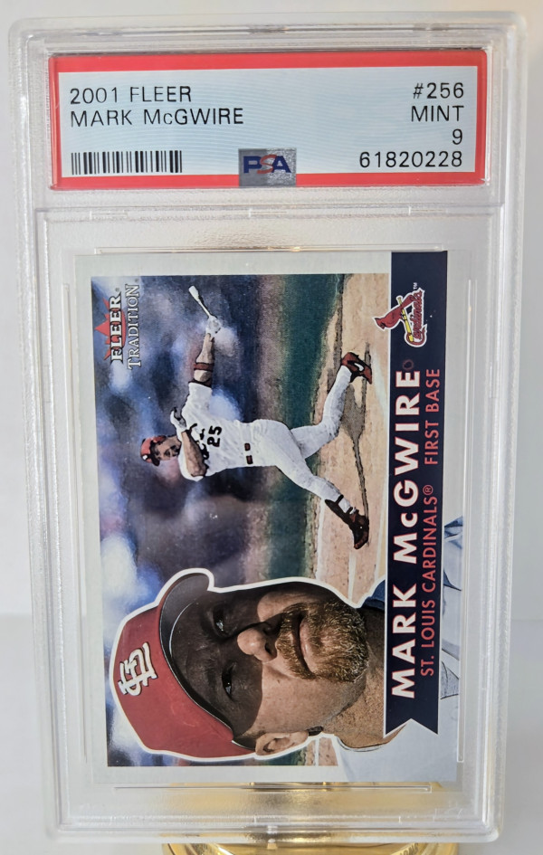 The product is a Mark McGwire trading card from the 2001 Fleer Tradition set. This baseball card features the St. Louis Cardinals player in the Major League Baseball (MLB). Manufactured by Fleer/SkyBox International, the card is part of the base set and has a card number of 256, representing the 2001 season. It is a valuable collectible for baseball fans and collectors of sports trading cards.