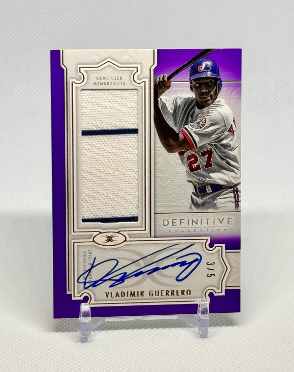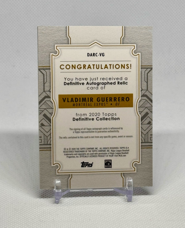 Beautiful 2020 Topps Definitive Relic Auto / 5 of Vladimir Guerrero. Item is packaged in top loader, team bag and two different sized bubble mailers for added protection.