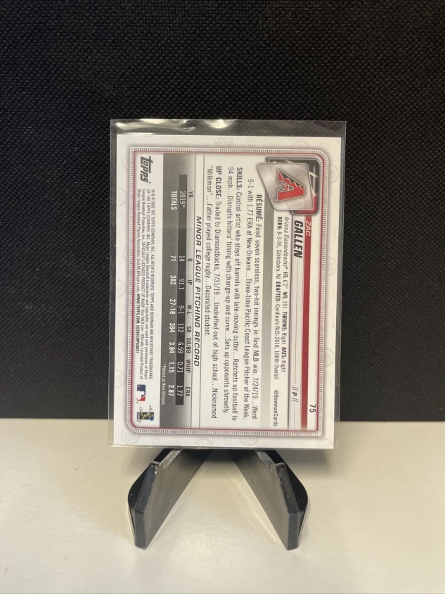 This Zac Gallen 2020 Bowman #75 Rookie Card is a must-have for any Arizona Diamondbacks fan or collector. It features the pitcher in his MLB uniform and is made of high-quality card stock. The card is an original, not a licensed reprint, and is part of the 2020 Bowman set.