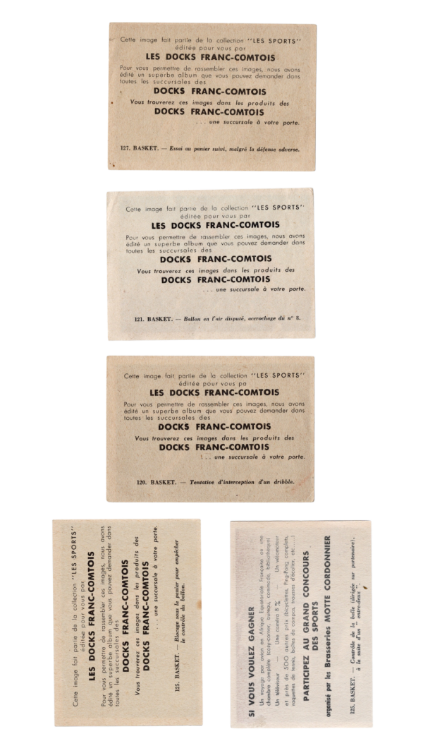 The Les Sports Par Les Images set consisted of 271 cards featuring a variety of different sports. There were 19 total basketball cards included. The back of the cards were sponsored, so the advertisements on these vary. There are 4 Docks Franc-Comtois variations and 1 Motte Cordonnier variation in this lot.