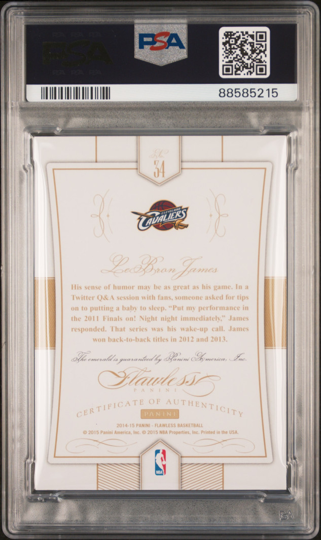 The 2014-15 Panini Flawless LeBron James #34 Emerald /5 is a highly sought after sports trading card featuring LeBron James of the Cleveland Cavaliers during the 2014-15 NBA season. This limited edition card is part of the Flawless set by Panini and is serial numbered to only 5 copies, making it a rare and valuable collectible for basketball fans and card collectors. The card is manufactured with card stock and professionally graded by Professional Sports Authenticator (PSA) as a Grade 7, ensuring its authenticity and quality. This unique piece of memorabilia captures LeBron's performance during the NBA Finals and is a must-have for any LeBron James or basketball fan's collection.