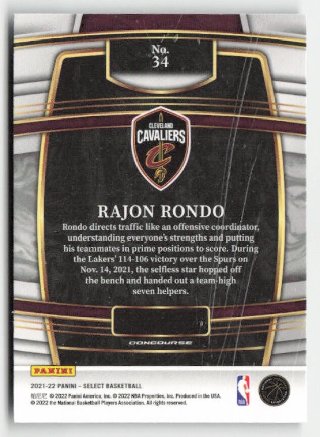 You are purchasing a 2021-22 Panini Select Rajon Rondo #34. You will receive the exact item in the photographs. Thank you for looking.