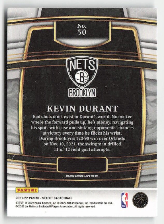 You are purchasing a 2021-22 Panini Select Kevin Durant #50 Blue (Retail Base). You will receive the exact item in the photographs. Thank you for looking.