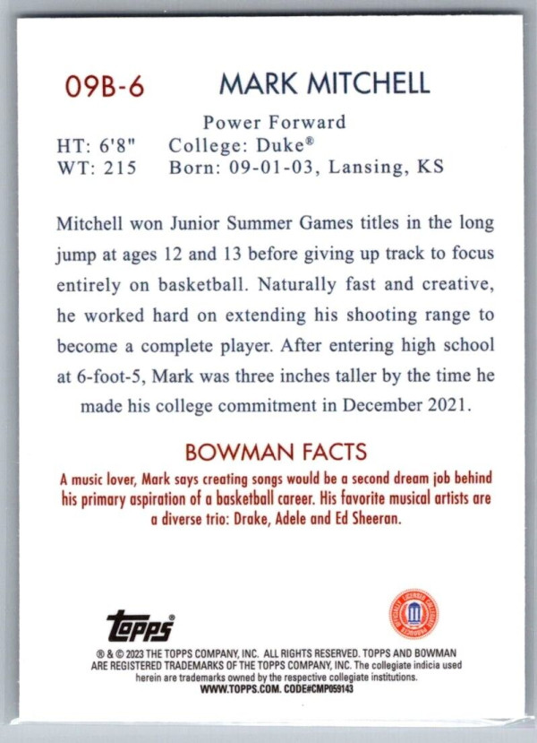 Description:Mark MitchellCategory:BasketballYear:2022Product:Bowman Chrome University 2009Team:Duke Blue DevilsCard Number:09B-6Dimensions:3¼" x 2¼"