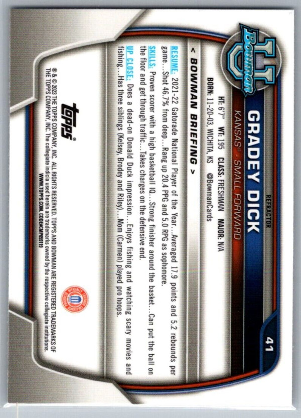Description:Gradey DickCategory:BasketballYear:2022Product:Bowman Chrome University RefractorTeam:Kansas JayhawksCard Number:41Dimensions:3¼" x 2¼"