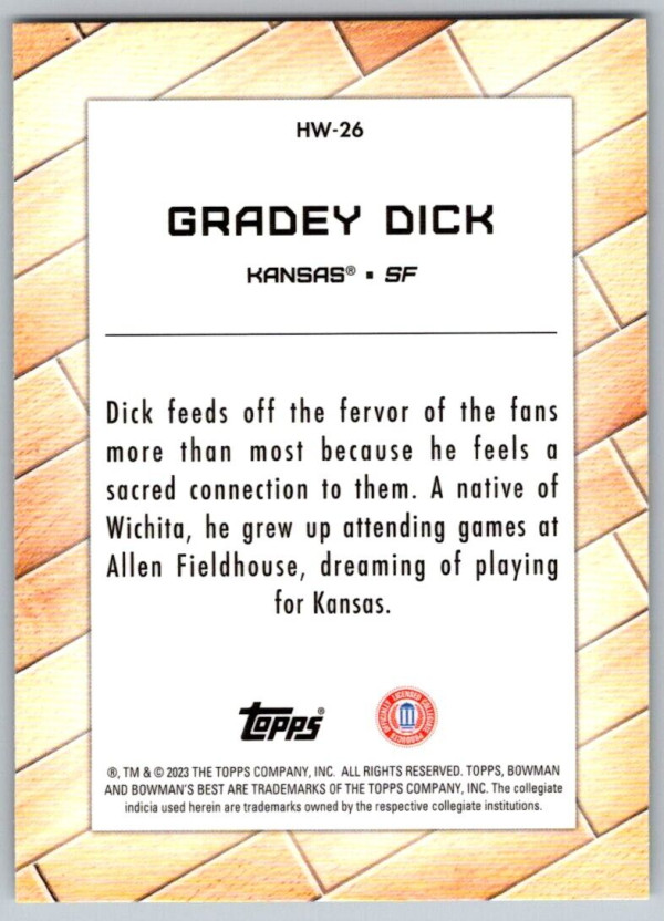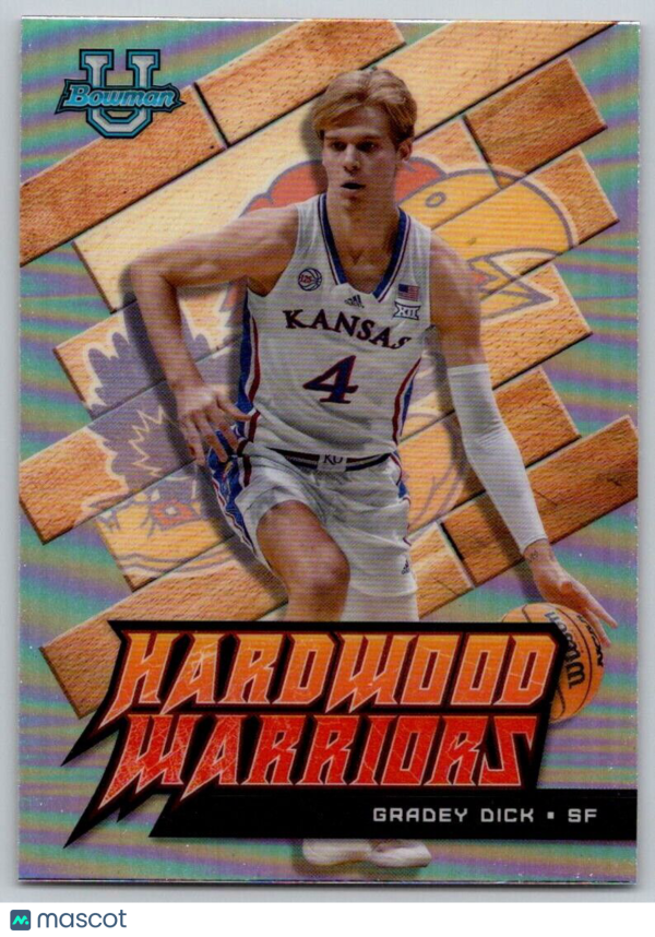 Description:Gradey DickCategory:BasketballYear:2022Product:Bowman University Best Hardowood WarriorsTeam:Kansas JayhawksCard Number:HW-26Dimensions:3¼" x 2¼"