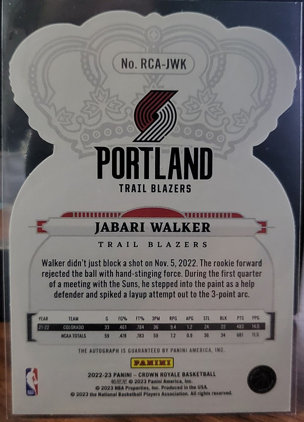 2022-23 Panini Crown Royale Jabari Walker RC Auto SSP /18 Red Mojo