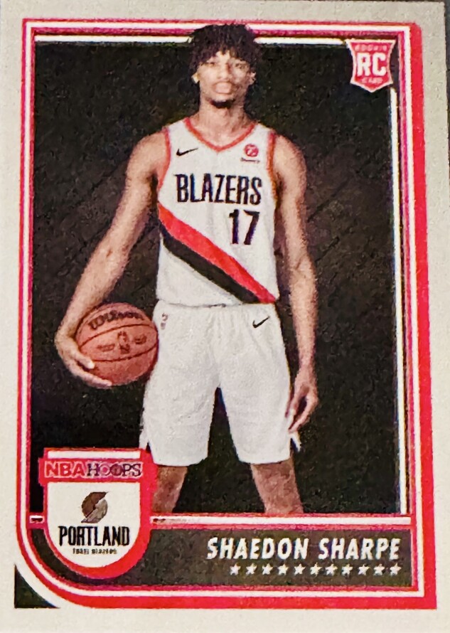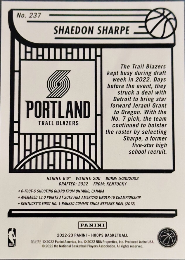 2022-23 Panini NBA Hoops Shaedon Sharpe Rookie Card (#237) featuring the Portland Trail Blazers guard.
