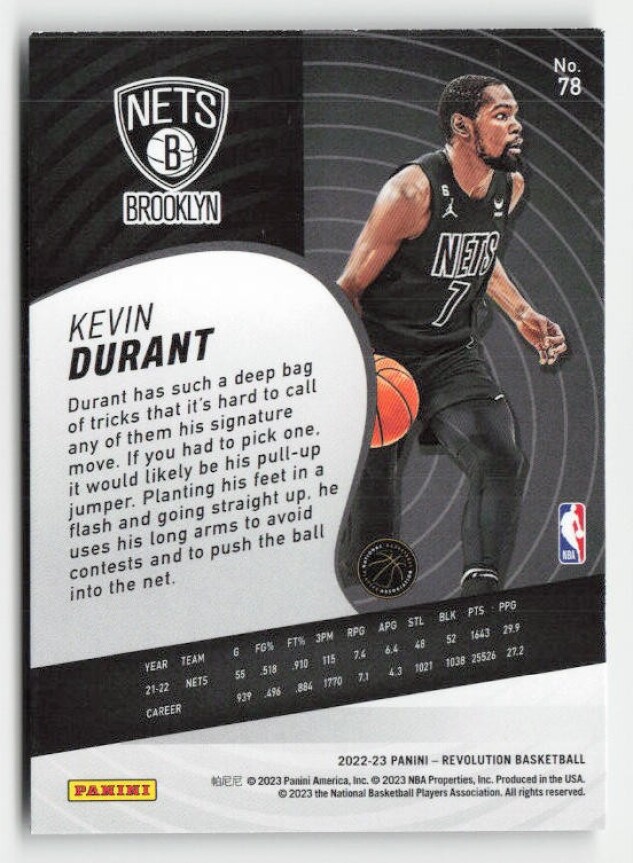 You are purchasing a 2022-23 Panini Revolution Kevin Durant #78. You will receive the exact item in the photographs. Thank you for looking.