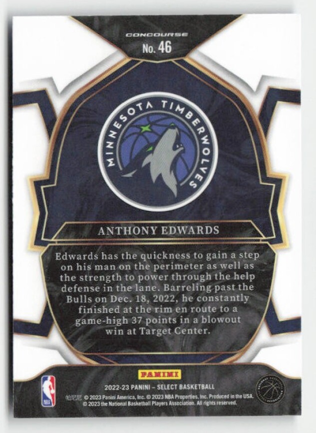 You are purchasing a 2022-23 Panini Select Anthony Edwards #46 Blue (Retail Base). You will receive the exact item in the photographs. Thank you for looking.