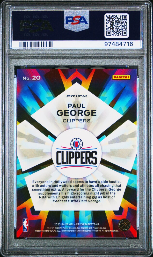 The 2023 Panini Prizm Kaleidoscopic Silver Paul George #20 PSA 10 GEM MINT trading card is a highly sought-after collectible featuring the talented NBA player Paul George. This sports trading card is part of the original 2023 Panini Prizm set, showcasing a unique Kaleidoscopic design that adds to its appeal. With a perfect grade of 10 from Professional Sports Authenticator (PSA), this card is considered to be in mint condition, making it a valuable addition to any basketball card collection. The card is made of high-quality card stock and is a must-have for fans of Paul George and the Los Angeles Clippers.