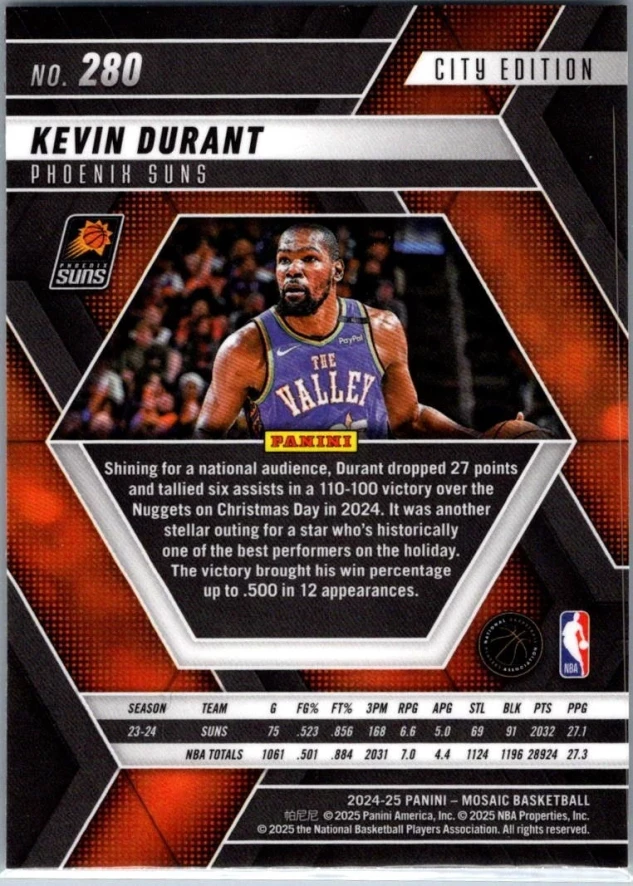 This is a nice example of a 2024-25 Panini Mosaic #280 Kevin Durant