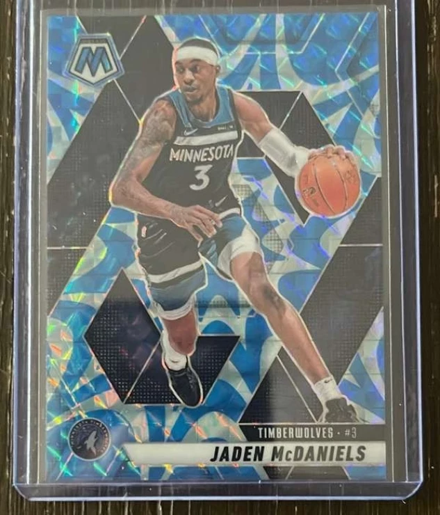 This is a nice example of a 2024-25 Panini Mosaic - Reactive Blue Mosaic #101 Jaden McDaniels