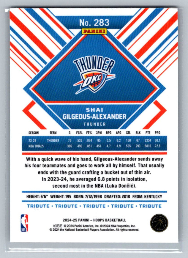 You are purchasing a 2024-25 Panini NBA Hoops Shai Gilgeous-Alexander #283 Premium Tribute Oklahoma City Thunder. You will receive the exact item in the photographs. Thank you for looking.