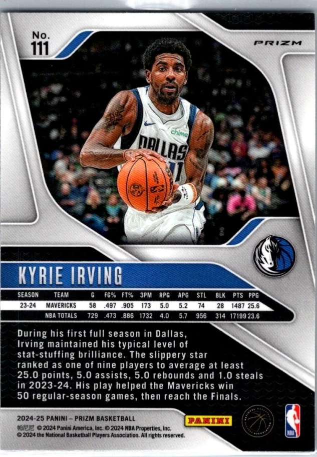 This is a nice example of a 2024-25 Panini Prizm #111 Kyrie Irving Prizms Silver