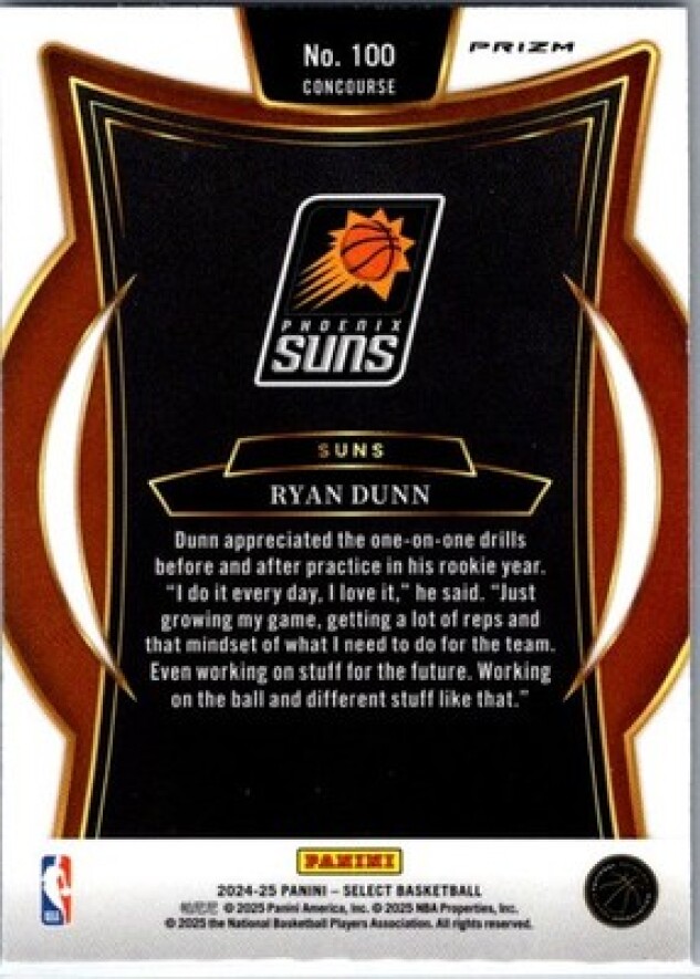 This is a nice example of a 2024-25 Panini Select #100 Ryan Dunn Blue Prizm