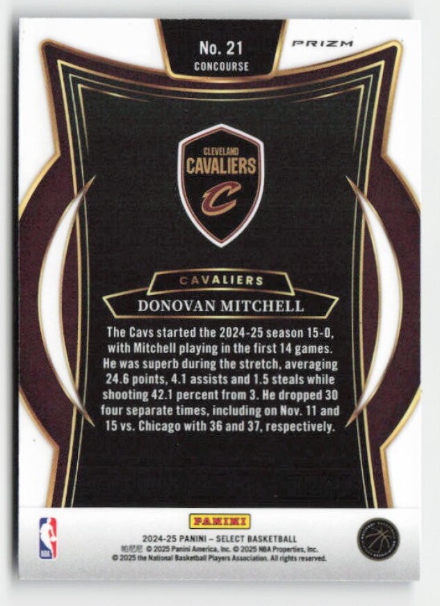 You are purchasing a 2024-25 Panini Select Donovan Mitchell #21 Blue Cracked Ice Prizm. You will receive the exact item in the photographs. Thank you for looking.