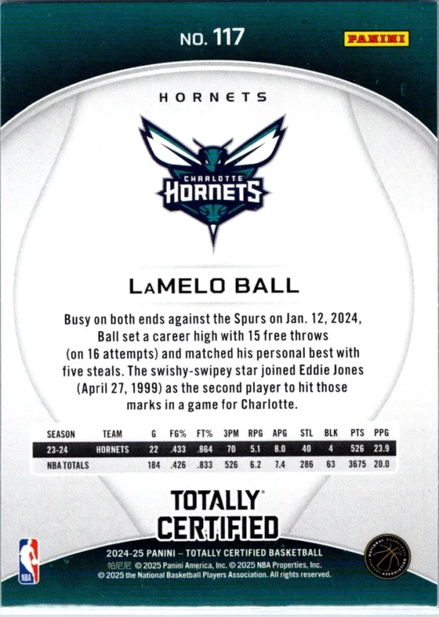 This is a nice example of a 2024-25 Panini Totally Certified #117 LaMelo Ball