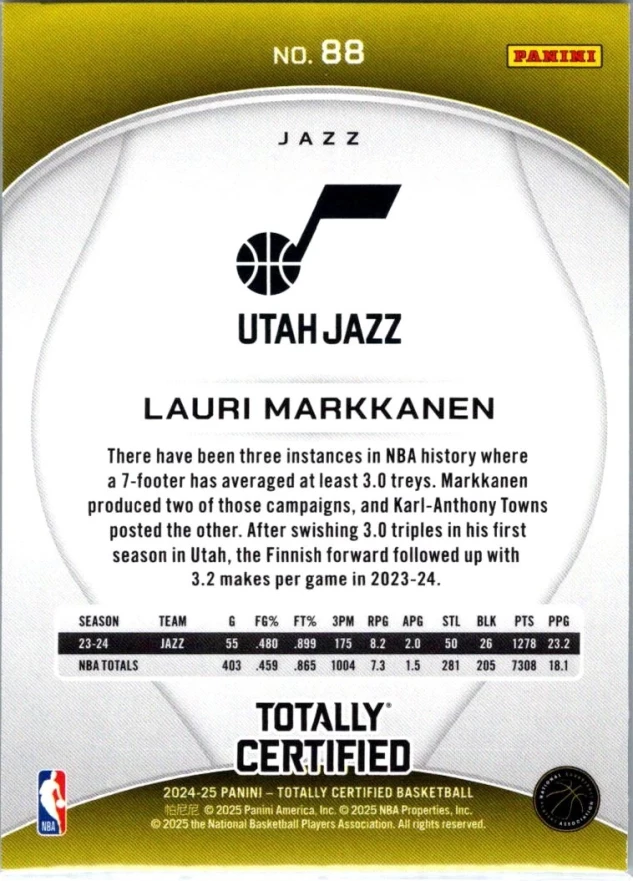 This is a nice example of a 2024-25 Panini Totally Certified #88 Lauri Markkanen