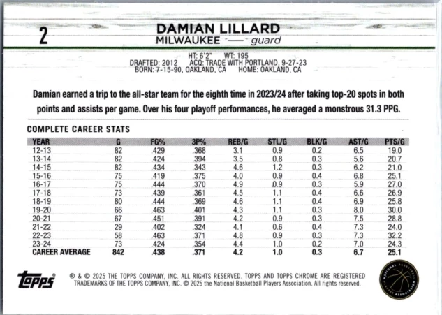 This is a nice example of a 2024-25 Topps Chrome Sapphire #2 Damian Lillard