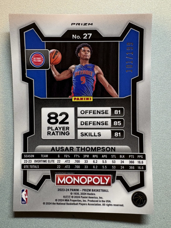 2024 Monopoly Prizm Ausar Thompson RC Blue Color Match /199