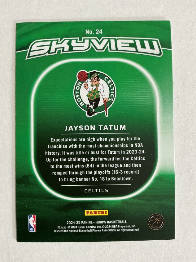 Score a must-have addition for your NBA collection with this 2024 Panini NBA Hoops Skyview Jayson Tatum #24 card! Featuring the Boston Celtics superstar, this card is perfect for fans and collectors looking to celebrate one of the league’s brightest talents. Don’t miss your chance to own a piece of the latest Panini release, sure to be a highlight in any basketball card lineup.