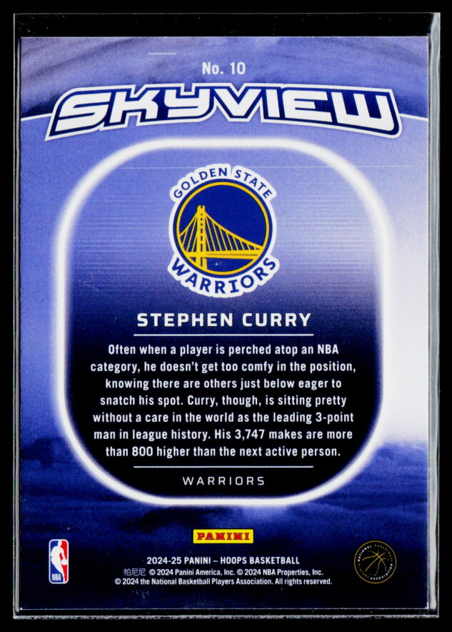 You are purchasing a 2024 Panini NBA Hoops Skyview Stephen Curry #10. You will receive the exact item in the photographs. Thank you for looking.