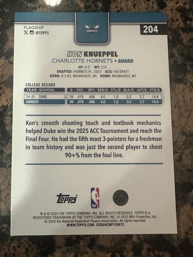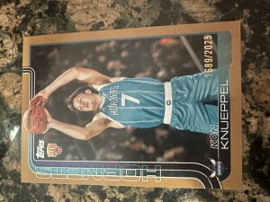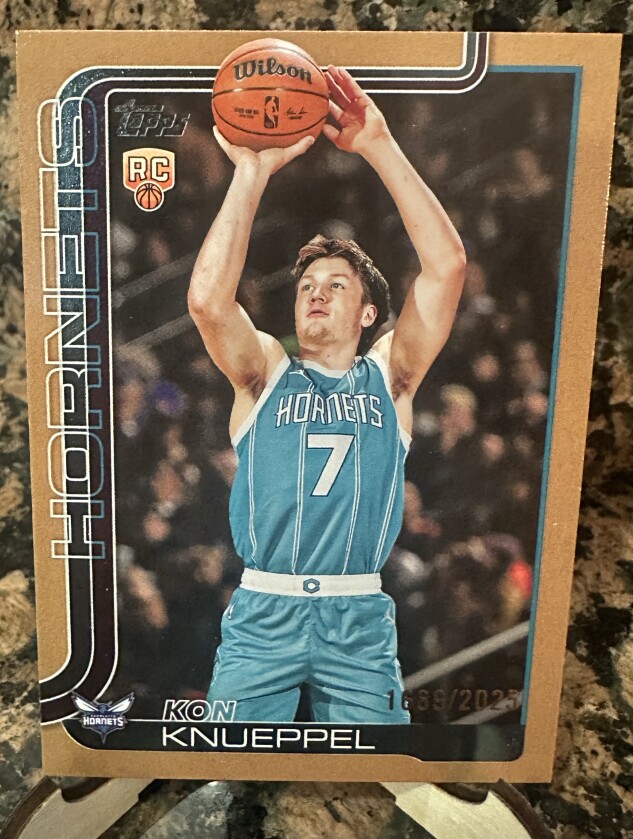 The 2025-26 Topps Kon Knueppel #204 Gold trading card is a rare and sought-after collectible featuring the rookie player from the Charlotte Hornets in the NBA. This limited edition card is serial numbered and part of the base set, making it a valuable addition to any basketball card collection. Manufactured by Topps in 2025, this card showcases a unique gold parallel variety that adds to its appeal. With only 2025 cards produced, this highly desirable item is a must-have for basketball card enthusiasts looking to own a piece of NBA history.