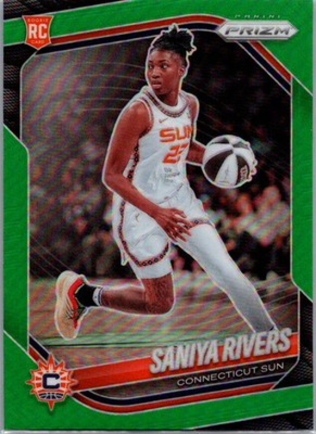 This is a nice example of a 2025 Panini Prizm WNBA #131 Saniya Rivers Green Prizms