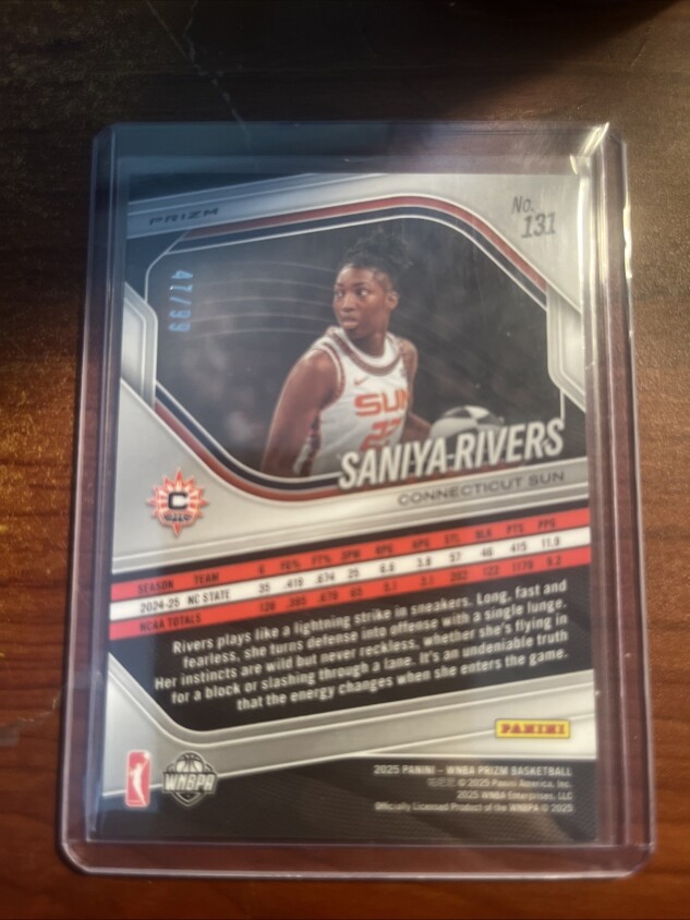 You are purchasing a 2025 Panini Prizm Saniya Rivers #131 Orange Prizm Short Print Parallel/Variety Rookie Base Set. You will receive the exact item in the photographs. Thank you for looking.