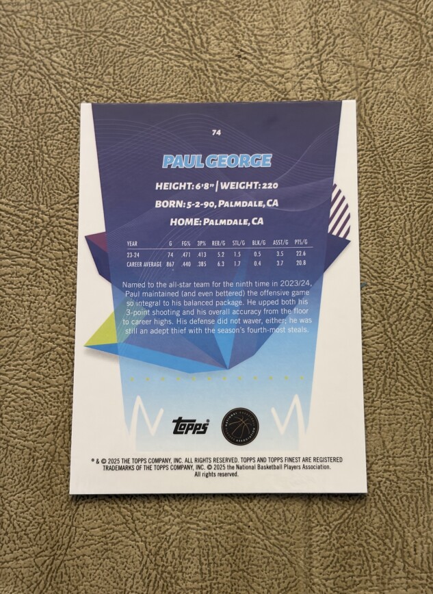 2025 Topps Finest Blue /175 Paul George #74 Basketball NBA Card